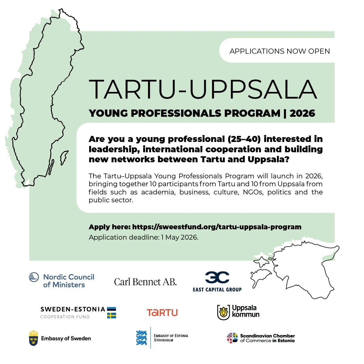 The program is initiated by the Sweden–Estonia Cooperation Fund and co-funded by the Nordic Council of Ministers, Carl Bennet AB, East Capital, City of Tartu and City of Uppsala.